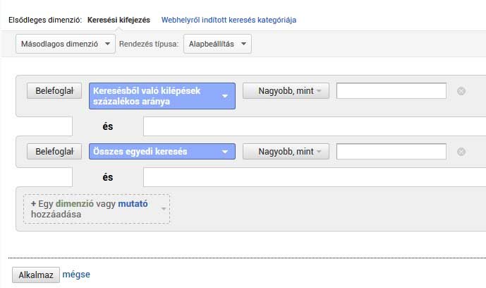 Ha ez megvan, akkor ismét egy egyéni szűrőt kell beállítanod, ahogyan a visszafordulásnál is tetted. Kattints a haladó feliratra a táblázat felett, és adj meg két mutatót: Keresésből való kilépések százalékos aránya, és Összes egyedi keresés (használd a + Egydimenzió vagy mutató hozzáadása gombot a második hozzáadásához):