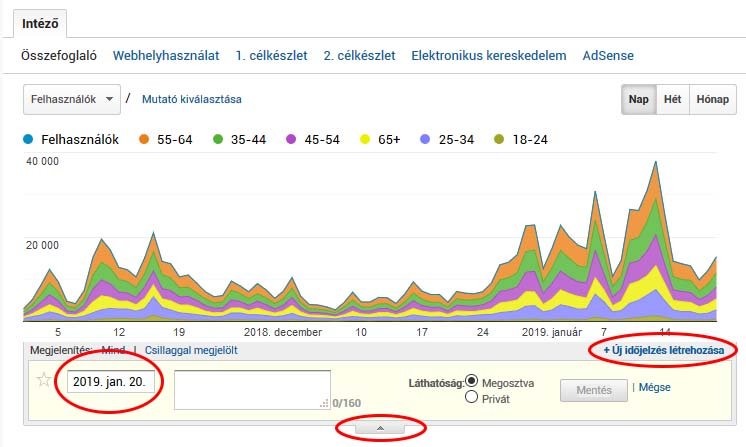 Ha szeretnél megjegyzést írni, akkor nyiss meg egy bármilyen jelentést, aminek van grafikonja, és kattints a grafikon alatti apró, lefelé mutató nyílra. Ez után a grafikon jobb alsó sarkában megjelenik a + Új időjelzés létrehozása opció. Ne felejtsd el beállítani a dátumot – az időjelzés nem oda kerül majd, ahová a grafikonon kattintottál!