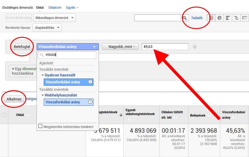 A Minden oldal jelentésben megjelenik a Visszafordulási arány oszlop, aminek tetején webhelyed átlagos arányát láthatod. Kattints a haladó gombra a táblázat felett, és állíts be egy szűrőt, ami az átlagértéknél nagyobb visszafordulási arányú oldalakat mutatja meg. Ez után rendezd sorba a táblázatot visszafordulási arány szerint, és kezdj el foglalkozni a legsúlyosabb esetekkel.