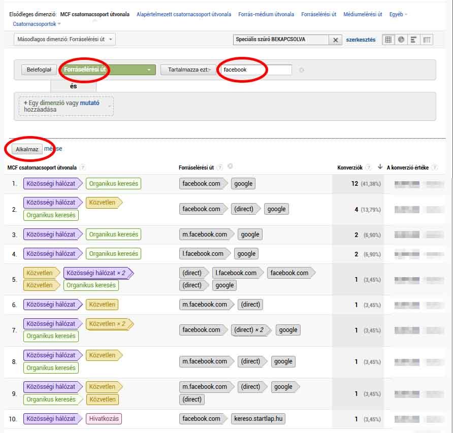 Ha szeretnéd csak azokat az útvonalakat látni, amelyek egy bizonyos csatornát, vagy interakciós pontot tartalmazzák, (például csak azokat, amiknek a Facebook is része), akkor szűrőt kell aklalmaznod: