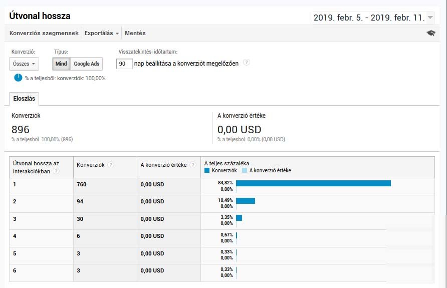 Ez a jelentés azt mutatja meg, hogy hány konverzió történt az olyan útvonalak végén, amelyek 0-1-2-3 stb. hosszúak voltak, illetve, hogy melyik látogatás során konvertált a legtöbb felhasználó.