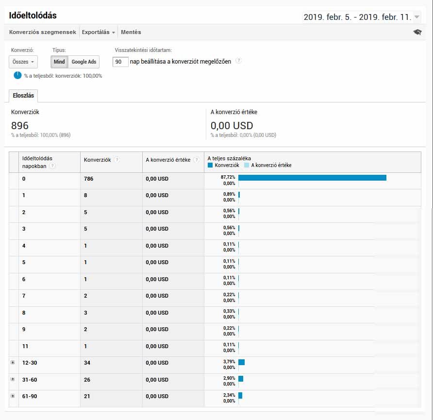 Ez az információ több szempontból is hasznos. Ha például azt látod, hogy az ügyfelek többsége több, mint 30 nap után konvertál, akkor fontos, hogy a konverziós időtartam ne 30, hanem több (60 vagy 90) napra legyen állítva a Google Ads rendszerében (ahol ezt az Eszközök > Keresési hozzárendelés felületen állíthatod be).