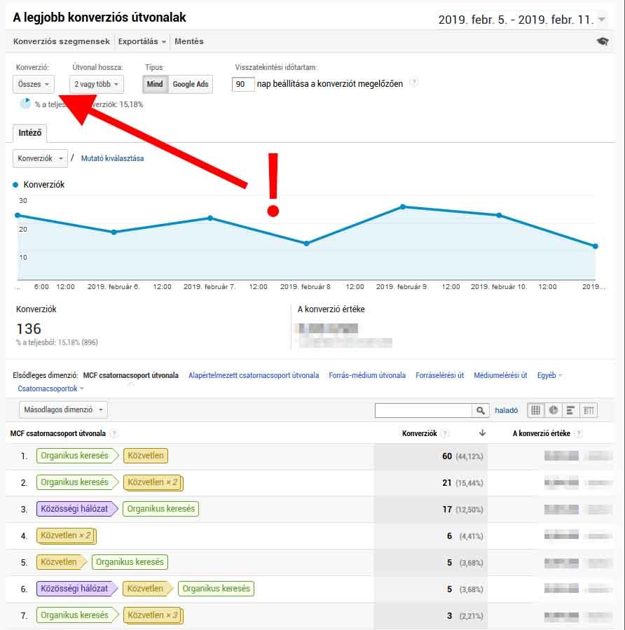 Hol: Konverziók > Többcsatornás útvonalak > A legjobb konverziós útvonalak