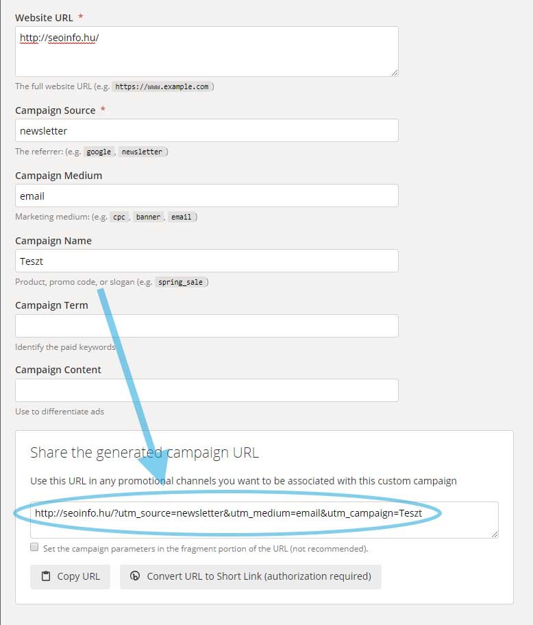 Ha minden megvan, akkor a lejjebb megjelenik egy hivatkozás, amibe a Google automatikusan belehelyezte az általad megadott paramétereket: